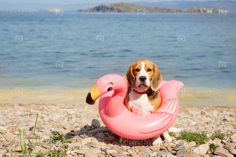 Собака породы бигль в надувном плавающем фламинго сидит на галечном пляже у моря