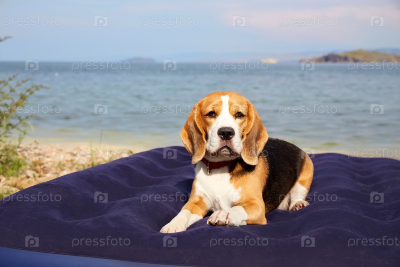 Собака породы бигль лежит на надувном матрасе на пляже у моря