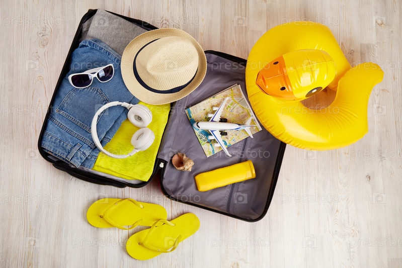 Открытый чемодан с одеждой и аксессуарами для отпуска на море