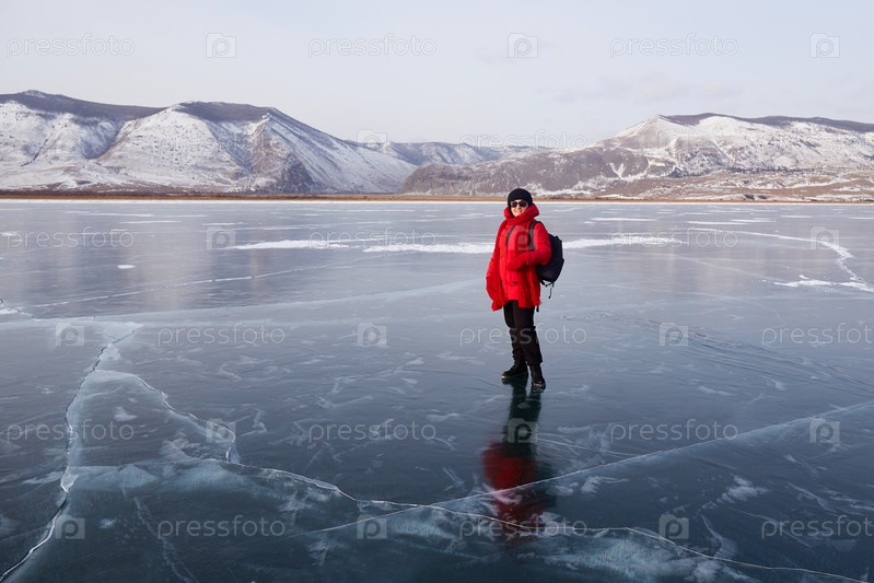 Счастливая путешественница в красном пуховике стоит на прозрачном льду