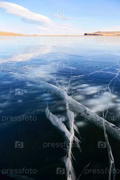 Замерзшее озеро Байкал в солнечный зимний день. Прозрачный гладкий лед с трещинами