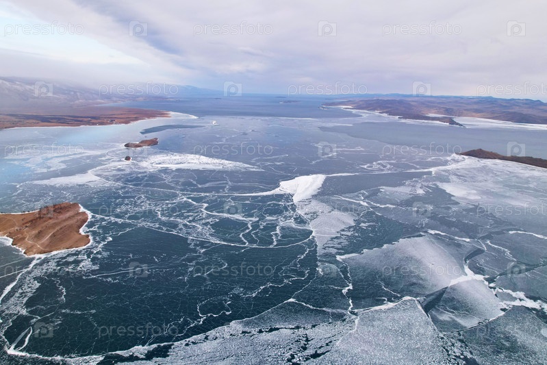 Замерзшее озеро Байкал в декабре, вид сверху. Облачное грозовое небо