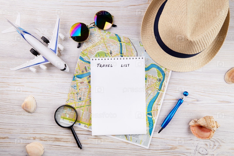 Дорожный блокнот с принадлежностями на деревянном столе, вид сверху
