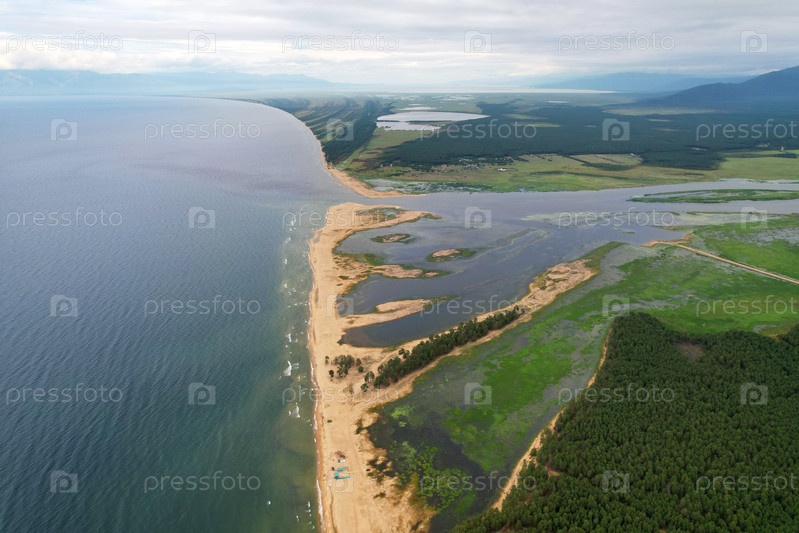 Вид с воздуха на реку Баргузин, впадающую в озеро Байкал, в пасмурный день