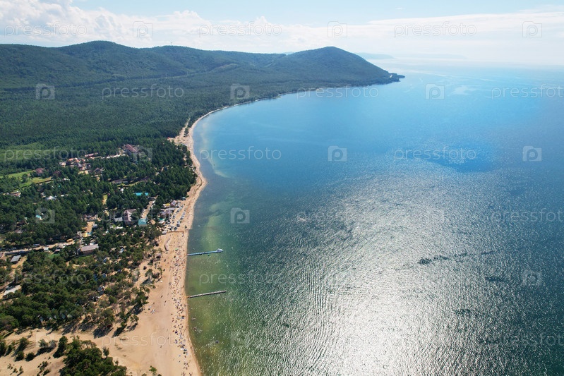 Летний пейзаж с воздуха. Песчаный пляж на берегу озера Байкал