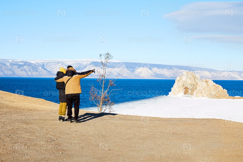Мужчина и женщина путешествуют по озеру Байкал зимой