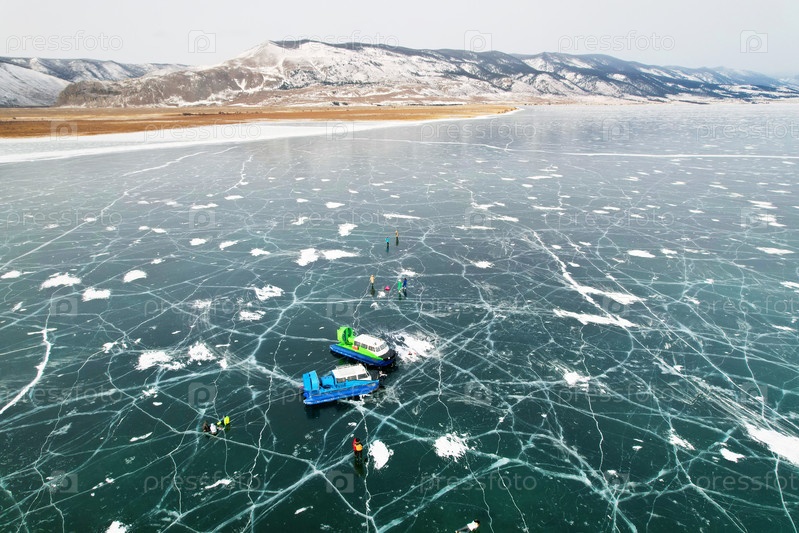 Зимний пейзаж замерзшего озера Байкал. Туристы идут по прозрачному льду
