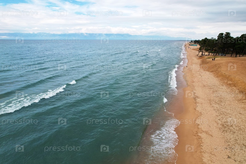 Баргузинский залив озера Байкал с воздуха. Красивый летний морской пейзаж