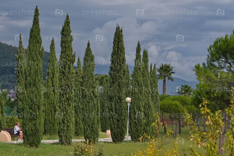 Россия, Сочи. Строгий вид пирамидальных тополей в орнитологическом парке на побережье Черного моря