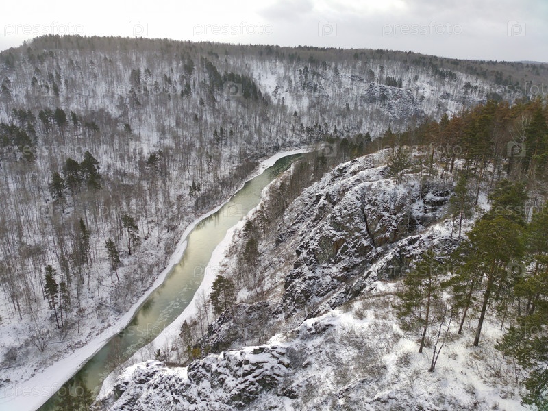 Река Бердь с квадрокоптера Бёрдские скалы, туристическая тропа Зверобой, Новосибирская область, Россия.Река Бердский в районе Berdsky Rocks, пешеходная трасса Св