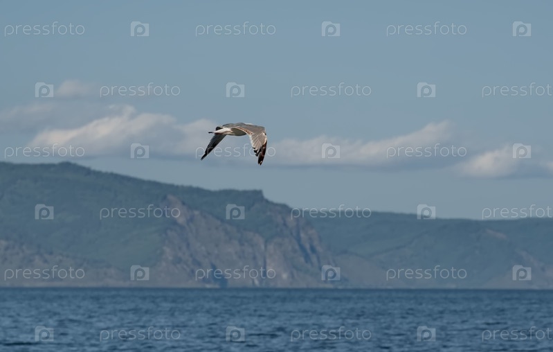 Россия. Иркутская область. Полет чайки на фоне неба с облаками над озером Байкал на набережной города Слюдянка