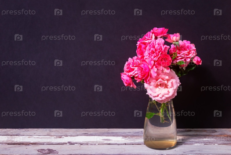 Розовые розы в вазе на старом деревенском деревянном столе на темном фоне. Просмотр с копией пространства