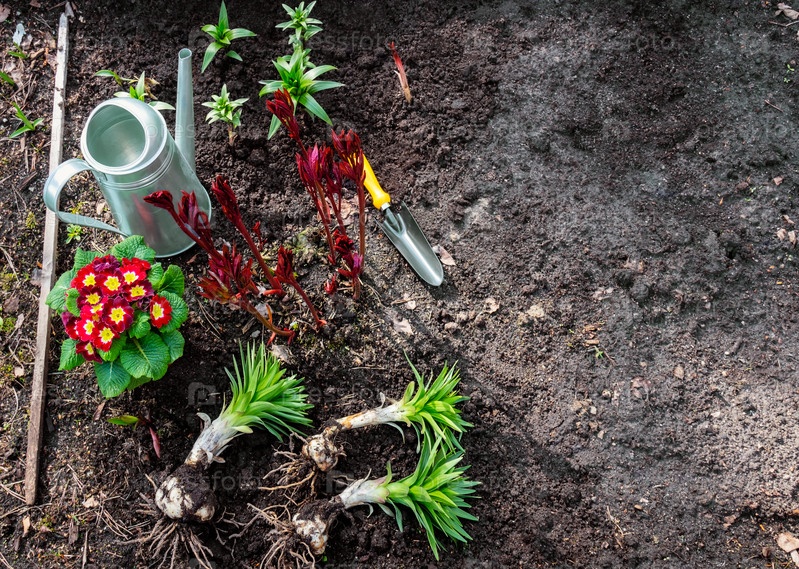 Лилии, пионы, примулы и садовые инструменты в весеннем саду на обработанной почве