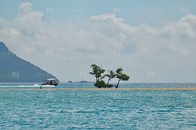 Малайзия. Остров Борнео. Вид на блуждающий рифовый остров в виде длинной узкой полосы из песка и ракушек