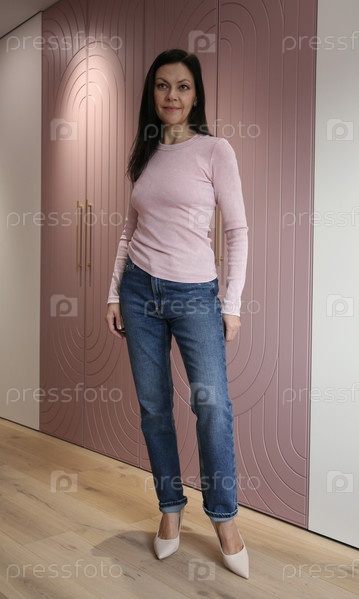Симпатичная женщина 51 год с макияжем в голубых джинсах и розовом лонгсливе на фоне розового шкафа смотрит в сторону
