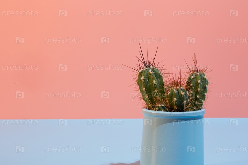 Креативный снимок. арт-кактус на двухцветном ярко-розово-голубом фоне на солнце с детскими тенями. копировальное пространство