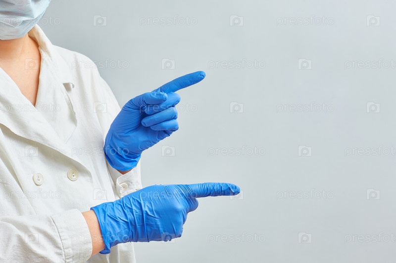 Руки доктора в синей медицинской перчатке. Рука врача-хирурга в синей перчатке, указывающая на что-то на белом фоне. Крупный план, безликий, пространство для копирования