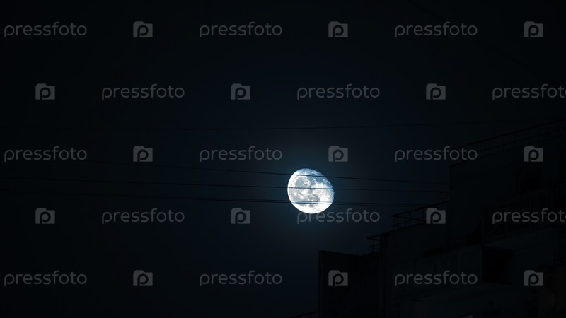 Ночной город с полной яркой луной на фоне темно-синего неба и электрических проводов. Атмосфера таинственная и безмятежная