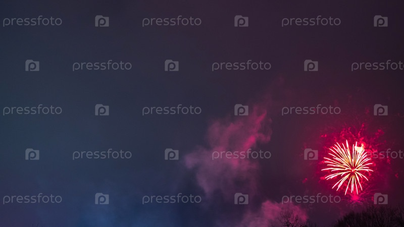 Взрыв фейерверка в ночном небе, демонстрирующий яркую вспышку красных оттенков. Контраст между ярким фейерверком и темным небом создает драматическую и живописную сцену