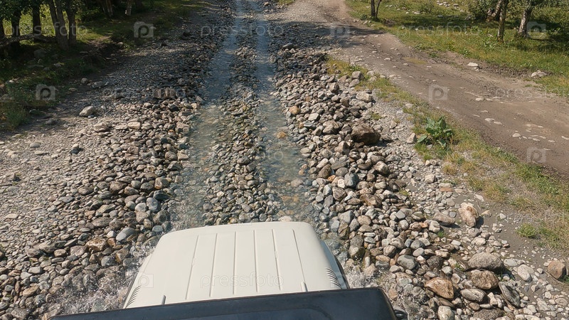 Вид от первого лица из открытого внедорожника, едущего вдоль мелководного ручья в горной местности