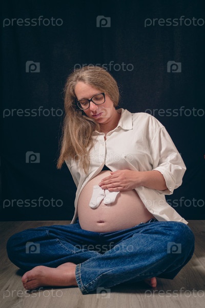 Беременная в повседневной одежде сидит на полу, скрестив ноги, и прижимает пару детских носков к своему голому животу. Темный фон контрастирует со светлой одеждой, создавая спокойную и эмоциональную сцену