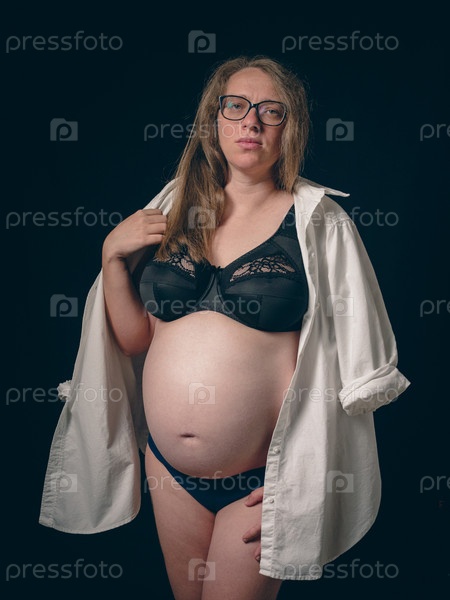 Будущая мама демонстрирует свой беременный живот на темном фоне. Она одета в черный бюстгальтер с кружевными деталями, синее нижнее белье и белую рубашку на плечах