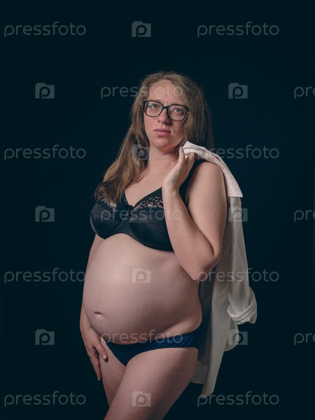 Беременная женщина стоит на темном фоне. На ней черный кружевной бюстгальтер и синие трусики, белая рубашка перекинута через одно плечо. Беременность Красота