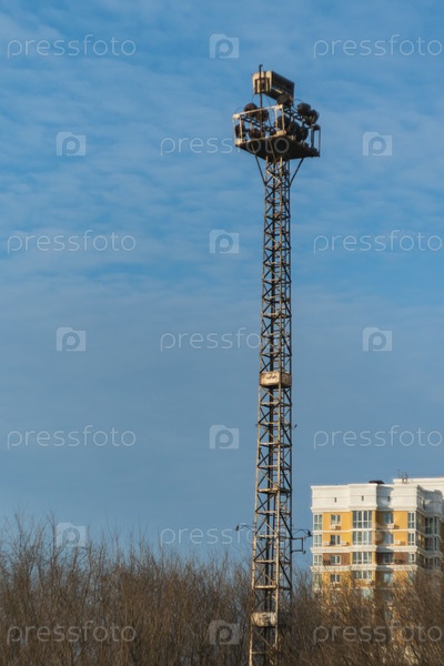 Высокая металлическая решетчатая башня с прожекторами на фоне голубого неба. Башня построена из металлических перекладин. Городской пейзаж, справа виден многоэтажный жилой дом