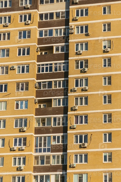 Часть многоэтажного жилого дома с узорчатым фасадом с многочисленными окнами и балконами. Внешняя облицовка здания желтого цвета с коричневыми вкраплениями