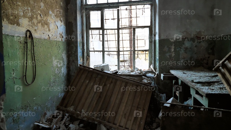 Заброшенная, полуразрушенная комната с облупившейся краской, разбитыми окнами и мусором, разбросанным по полу. Деревянная конструкция лежит рухнувшей возле окна, а со стены свисает веревка