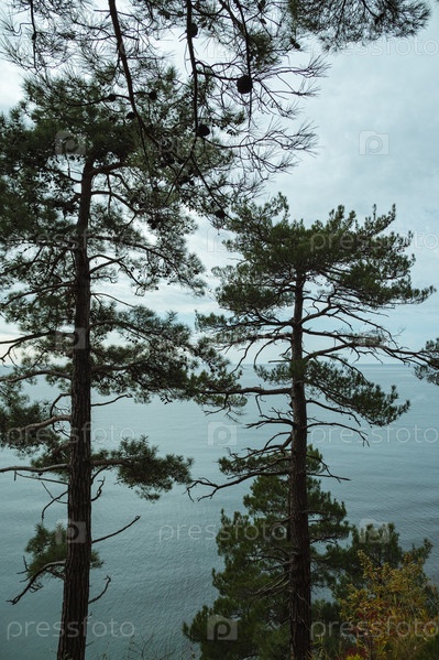 Две высокие сосны стоят на скале, возвышаясь над спокойным морем. Небо затянуто облаками, а ветви деревьев обрамляют безмятежный вид на океан