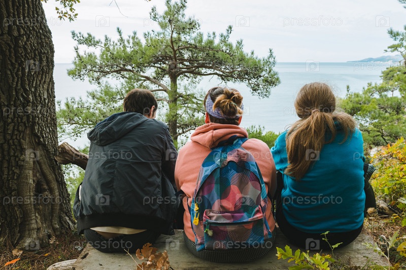 Три человека сидят на деревянной скамейке, любуясь живописным видом на море, окруженное деревьями. Каждый человек одет в куртку или толстовку с капюшоном, а один несет красочный рюкзак