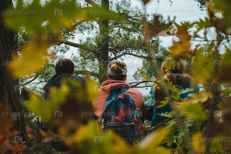 Три человека с рюкзаками сидят среди деревьев, глядя на море. Вид сзади. Сцена обрамлена осенними листьями, что создает безмятежную и естественную атмосферу