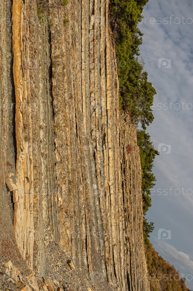 Отвесная скала с вертикальными слоями скал и редкой растительностью наверху, под частично облачным небом. Слоистая скала, подверженная эрозии под воздействием природных явлений