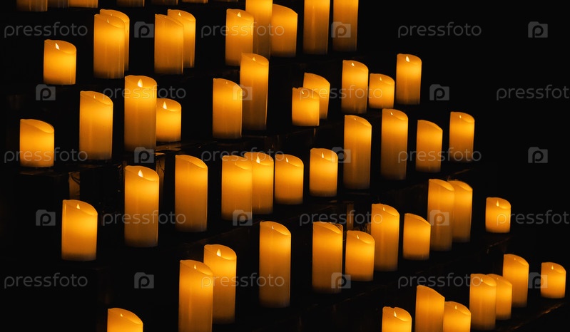 Ряды горящих свечей на ступенчатых полках. Теплый свет, излучаемый ими, создает атмосферу спокойствия и размышлений