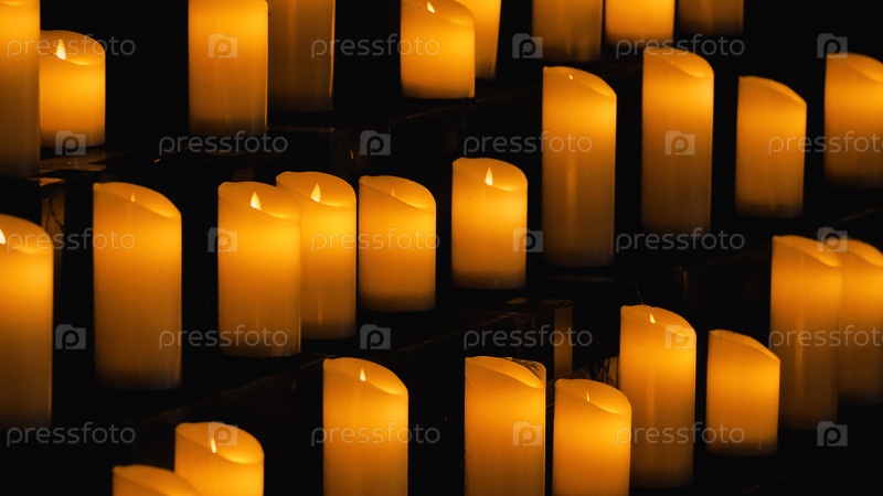 Множество зажженных цилиндрических свечей, расставленных на полках и излучающих теплое сияние. Спокойную и умиротворенную атмосферу подчеркивают тени, создавая созерцательное настроение