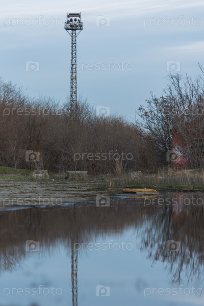 Лужа отражает высокую решетчатую коммуникационную башню, окруженную зарослями растительности. Мягкое освещение указывает на сумерки