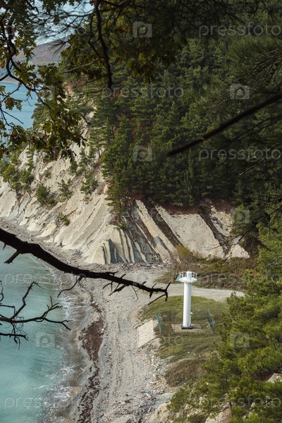 Маленький белый маяк стоит на скалистом берегу, окруженный пышными зелеными деревьями и крутыми скалами. Сцена обрамлена ветвями, что добавляет глубины прибрежному ландшафту
