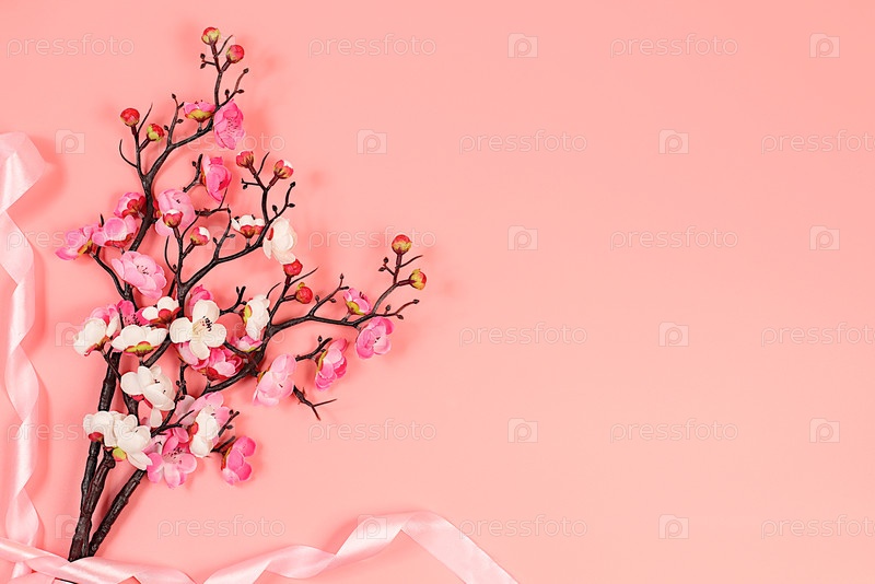 Весенняя абстрактная цветочная композиция, натюрморт с красивыми цветущими ветвями сакуры, баннер для экрана с местом для текста. Поздравительная открытка на день матери, женский день, с днем рождения