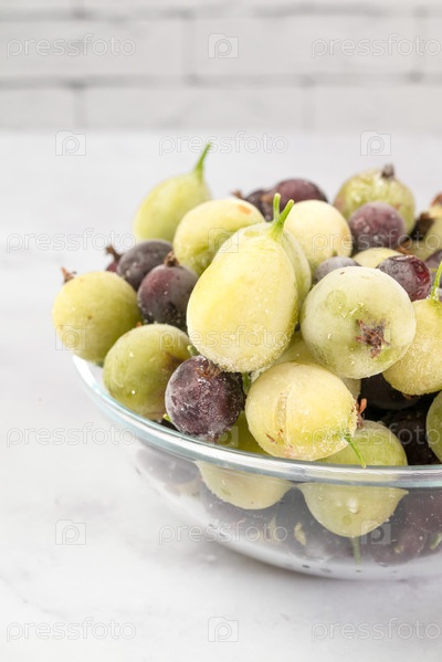 Замороженные ягоды крыжовника в стеклянной посуде на светлом фоне. здоровое вегетарианское блюдо. диетический продукт