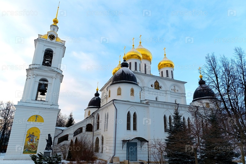 Дмитров, Московская область, Россия – 15 февраля 2025 г.: Успенский собор и колокольня Дмитровского кремля зимой