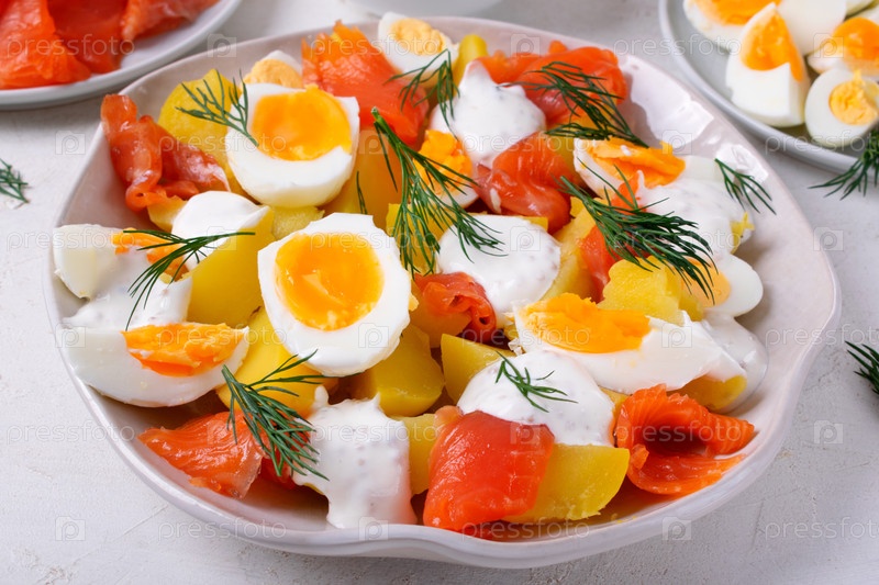 Салат с копченой форелью, вареными яйцами, картофелем и сметанным соусом, подается на белой тарелке
