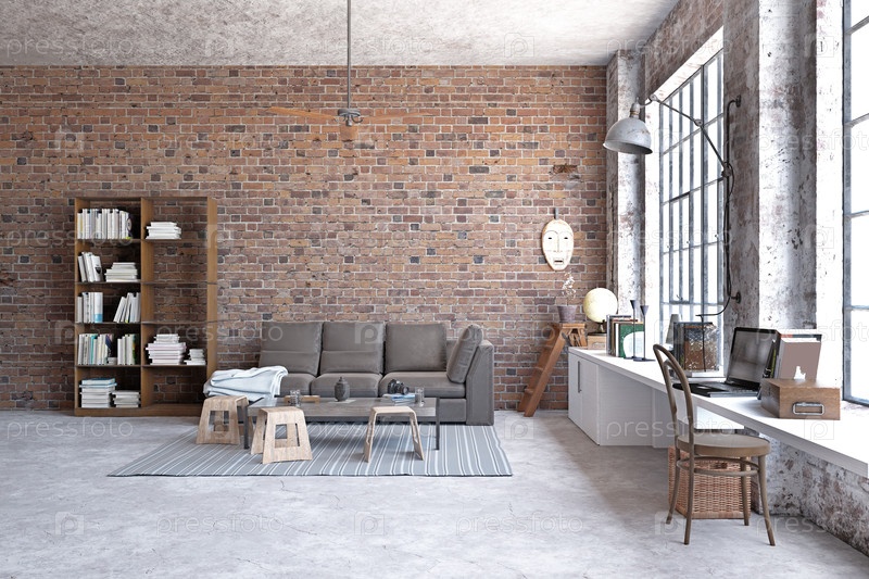Гостиная с кирпичными стенами, современная мебель