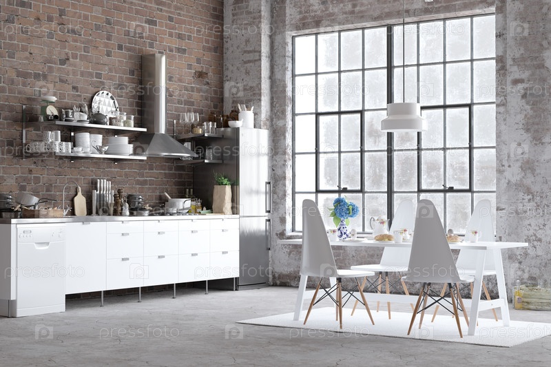 Стильная кухня с кирпичной стеной, белые шкафы