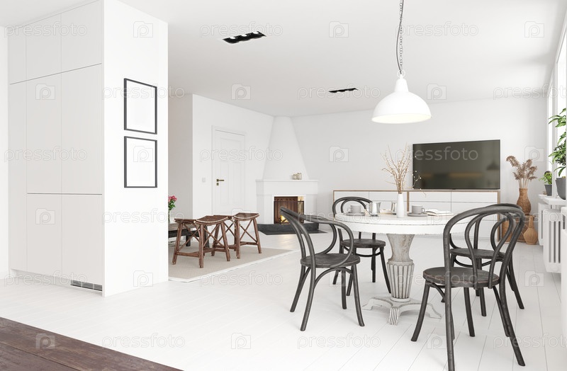 Современная белая столовая с черными стульями и телевизором. 3D-рендеринг