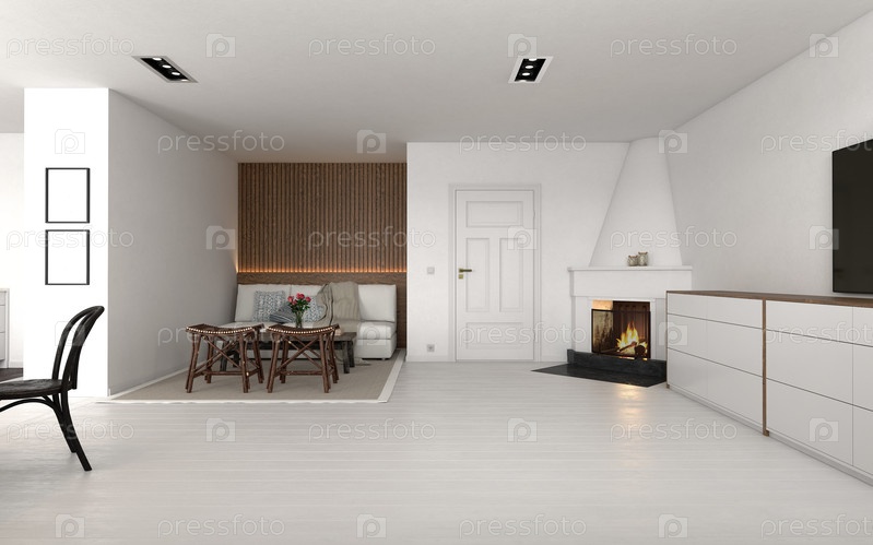 Современная белая столовая с черными стульями и телевизором. 3D-рендеринг