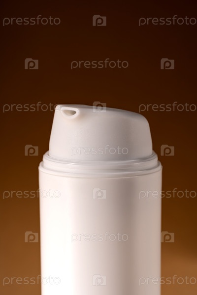 Пластиковая белая бутылка с насосом на коричневом фоне. Макет очищающей косметики для ухода за кожей. Концепция красоты для ухода за лицом и телом