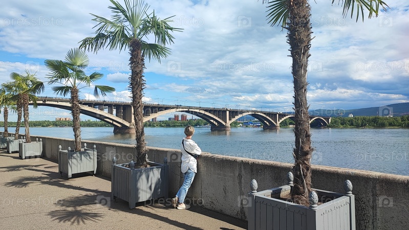 Девушка гуляет и смотрит на Коммунальный мост через реку Енисей в Красноярске Мост с купюрой 10 рублей Девочка смотрит на Коммунальный мост над рекой Енисей в городе Красноярск Мост с 10-рублевой банкнотой
