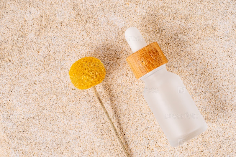 Косметический флакон с сывороткой с цветком краспедии. Косметика для ухода за кожей. Масло гиалуроновой кислоты, сыворотка с коллагеном и пептидами. Небрендированная упаковка на песчанике