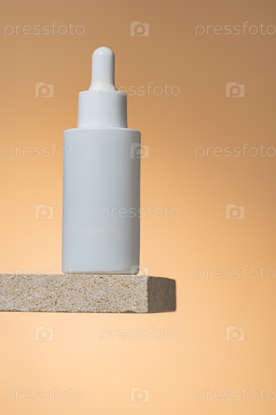Макет белой стеклянной бутылки на постаменте из натурального камня. Сыворотка для лица, эфирное масло для ухода за женской кожей на бежевом фоне, макет